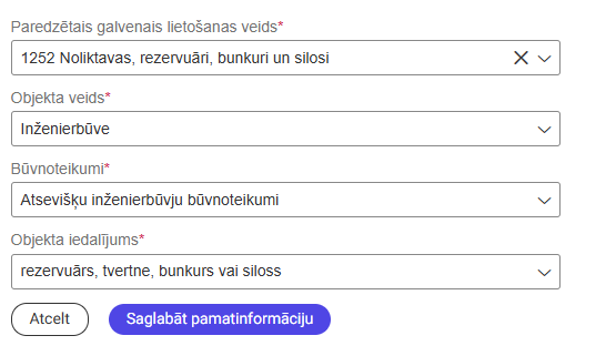 Lietotājam jāveic informācijas saglabāšana, nospiežot pogu "Saglabāt pamatinformāciju". Lietotājs nevar mainīt objekta veidu pēc sākotnējās būvniecības objekta saglabāšanas.