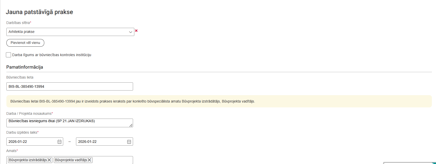 Ja lietotājam konkrētās būvniecības lietas prakses ieraksts eksistē, tad tiek atrādīts informatīvs brīdinājums: “Būvniecības lietai jau ir izveidots prakses ieraksts.”