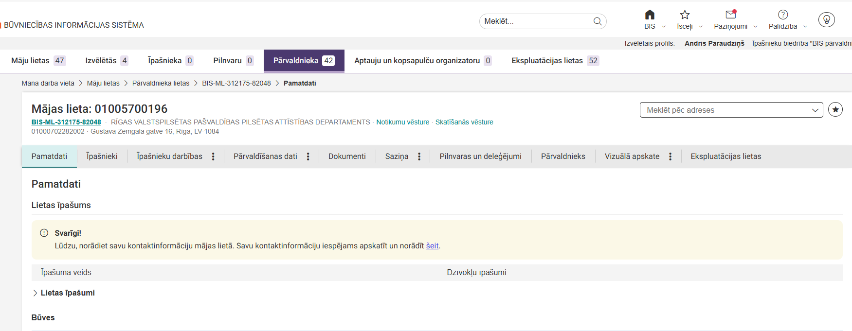 Mājas lietas sadaļā "Pamatdati" lietotājs redz sekojošus datus par Māju lietu: