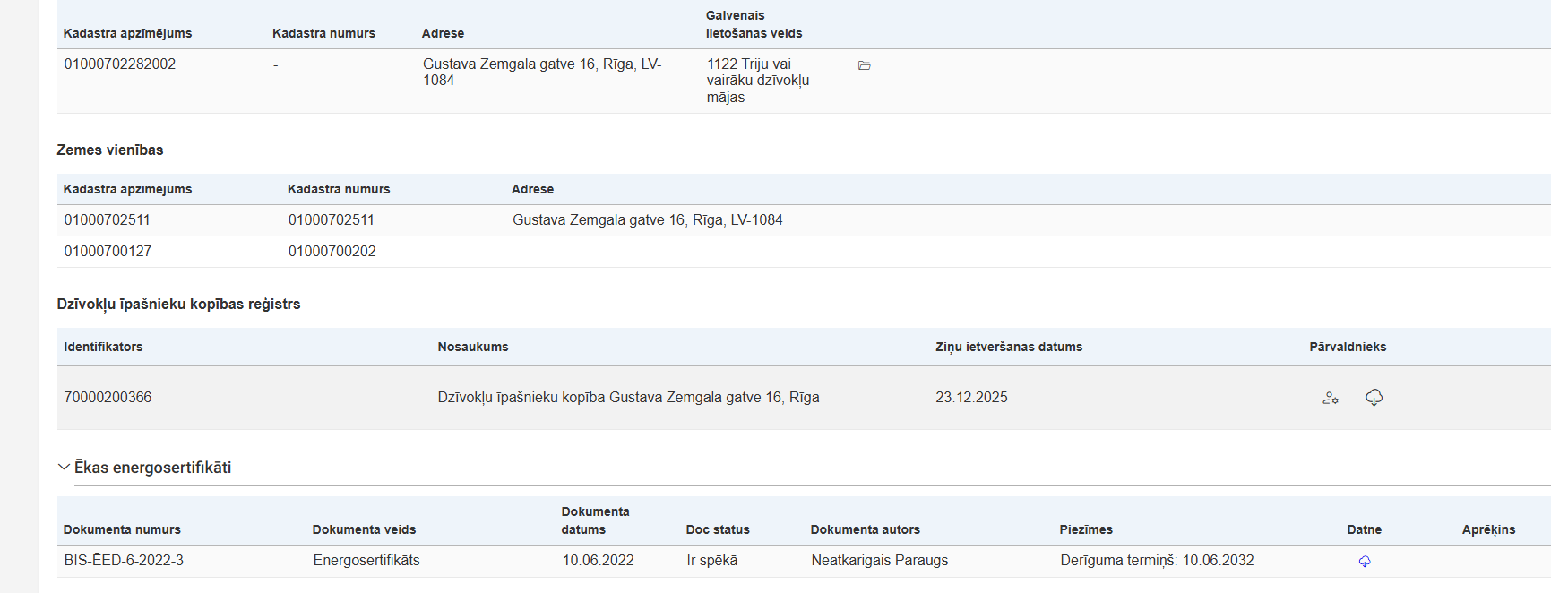 - Energosertifikāti – atrāda BIS reģistrētos energosertifikātus, kas ir spēkā. Ja mājas lietā nav spēkā esošu energosertifikātu, lietotājs redz brīdinājumu "Mājas lietā nav spēkā esošu energosertifikātu".