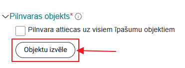- Pilnvaras objekts - iespēja izvēlēties un norādīt vienu vai vairākus īpašuma objektus par kuru tiek veidota pilnvara. Objektus var norādīt tikai no saraksta, jo piedāvāto objektu saraksts ir atkarīgs no pilnvaras veida un no lietotāja profila.