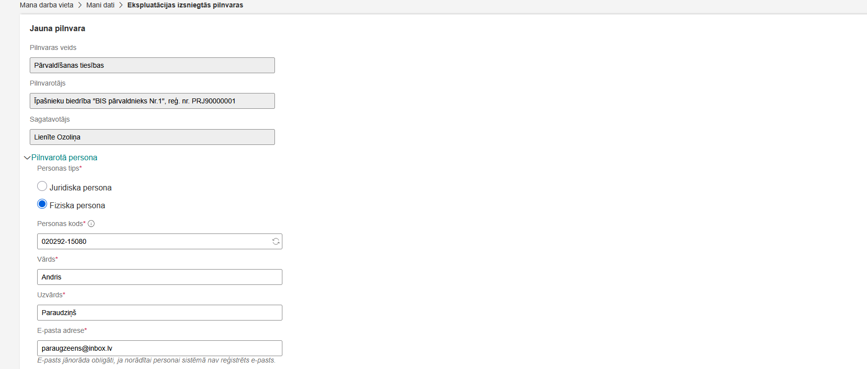 - Pilnvarotā persona - iespējams norādīt juridisku (tikai Latvijā reģistrētu uzņēmumu, kas ir reģistrēts UR) vai fizisku personu (tikai Latvijas iedzīvotāju), pēc BIS kopēju datu ievades principa;