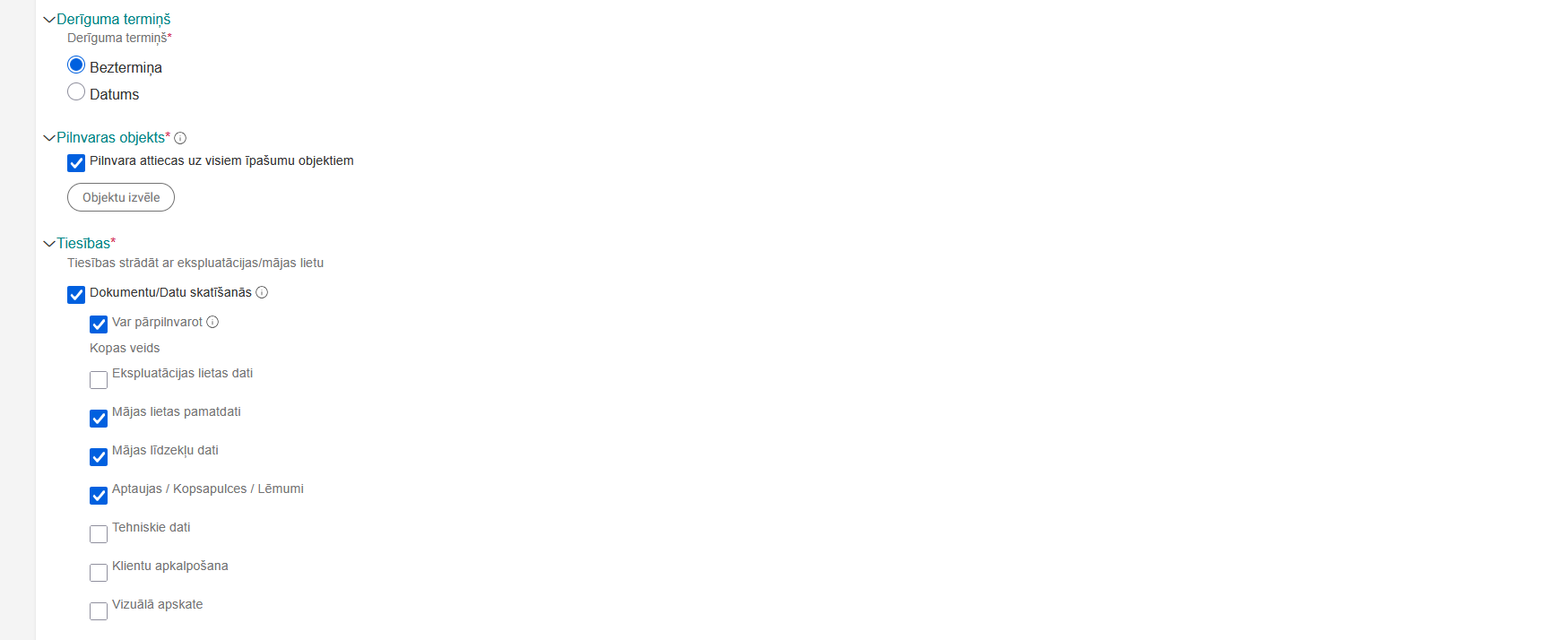 - Lietotājs var atzīmēt izvēles rūtiņu "Pilnvara attiecas uz visiem Pārvaldāmajiem objektiem" - pazīme piešķir pilnvarotajai personai rīcības tiesības visos pilnvarotāja pārvaldīšanā esošajos objektos - Mājas lietās un Ekspluatācijas lietās, un, mainoties pilnvarotāja Pārvaldāmo objektu sarakstam, pilnvara nav jāmaina, lai nodrošinātu piekļuvi jaunajiem objektiem.