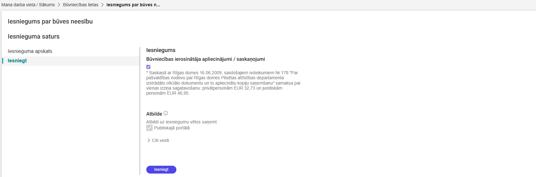 Lietotājs solī "Iesniegt" sadaļā “Būvniecības ierosinātāja apliecinājumi / saskaņojumi” redz paziņojumu par pašvaldības piemēroto nodevu/nodevām: