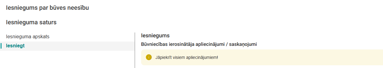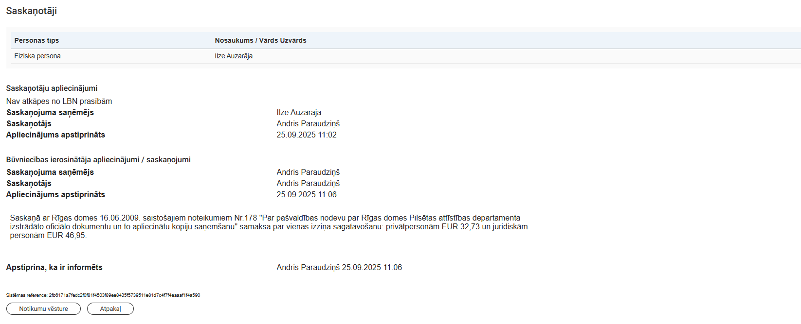 Iesniegtam dokumentam vai dokumentam lasīšanas režīmā blokā “Būvniecības ierosinātāja apliecinājumi / saskaņojumi” attēlo atbilstošā iesnieguma paziņojuma tekstu, iesniedzēju, dokumenta iesniegšanas būvvaldei datumu un laiku.