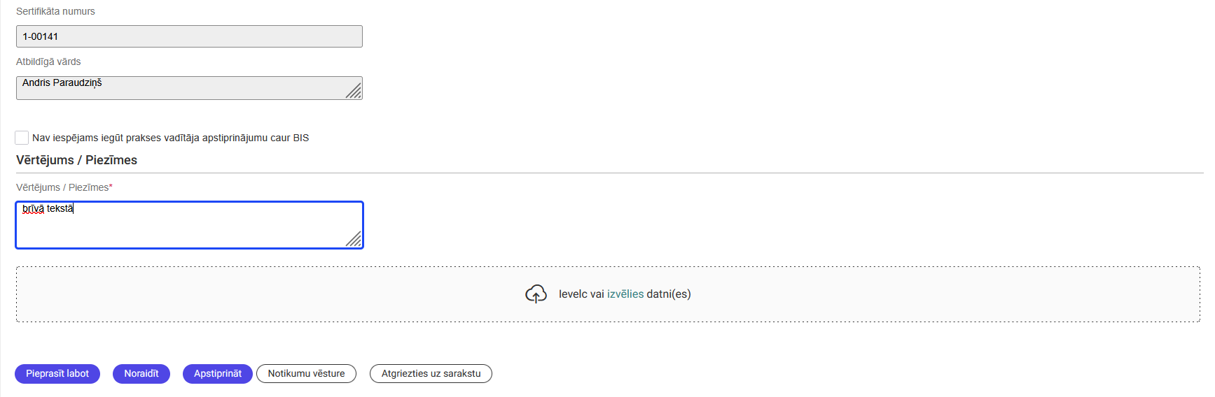 Lai apstiprinātu ierakstu, jāievada informācija brīvā tekstā laukā “Vērtējums/Piezīmes” un iespējams papildus pievienot vienu vai vairākas datnes.