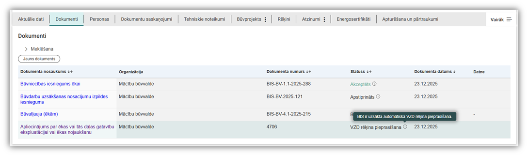 Bīvdarbu pabeigšanas dokumentā, solī "VZD pieprasījumi" ir redzams VZD pieprasījums ar veidu - Vienotā būvju reģistrācijas procesa pakalpojums.