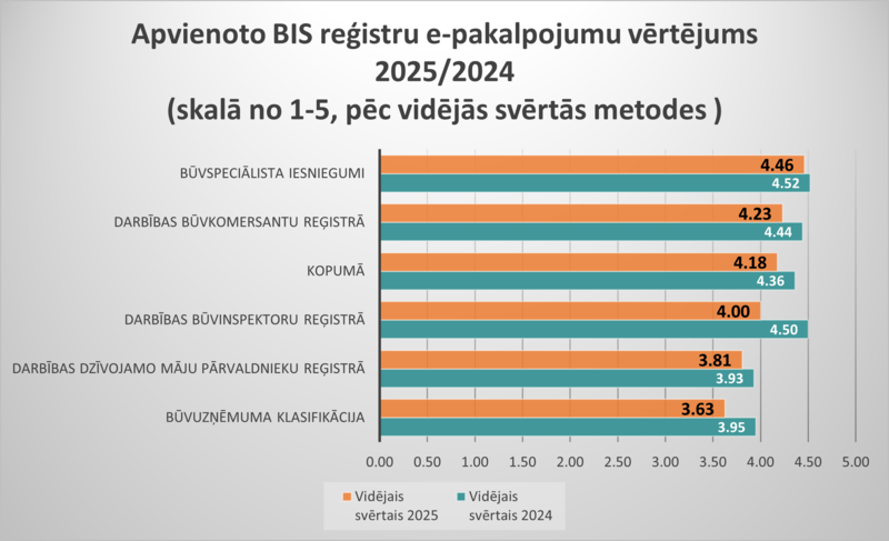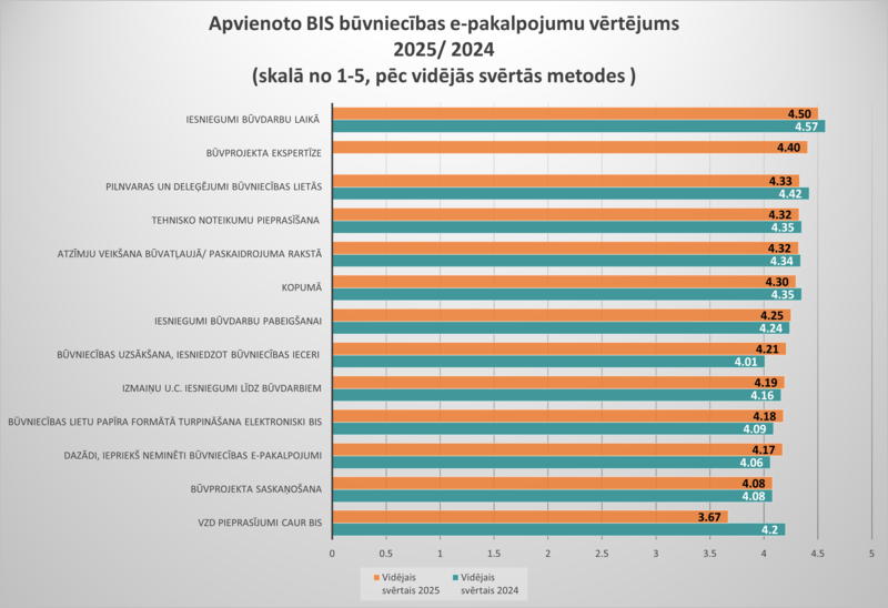 13 sagrupēto būvniecības e‑pakalpojumu kopējais vērtējums 2025. gadā ir 4,30 (pret 4,34 2024. gadā), kas ir neliels, bet nebūtisks kritums, ņemot vērā kopējo stabilitāti un augsto vērtējumu līmeni. Būvspeciālisti BIS darbību vērtē ievērojami augstāk (4,44), savukārt pārējo lietotāju vērtējums ir 4,21; to īpatsvars 2025. gadā pieauga par 1 %, kas arī veido kopējā rādītāja samazinājuma tendenci. Augstāk novērtētie būvniecības e‑pakalpojumi: