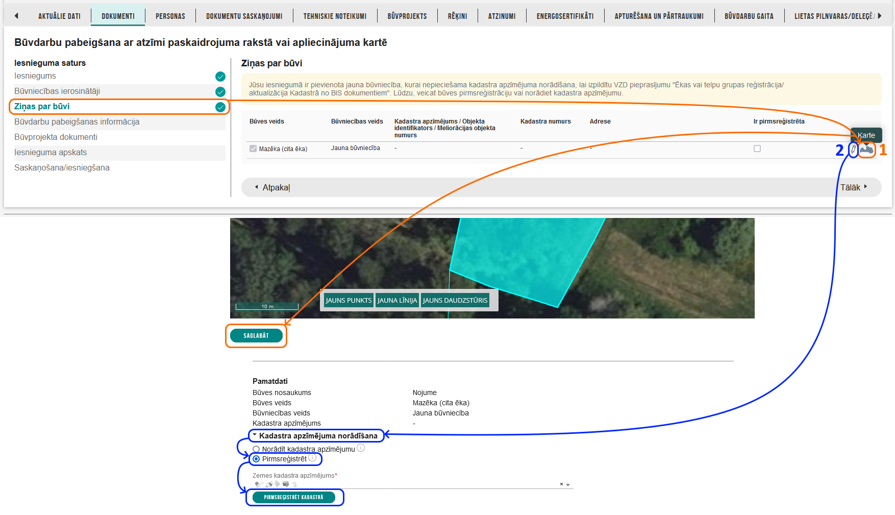 Iesniegumā par būvdarbu pabeigšanu izvēlēties: Ziņas par būvi >> {pie būves ikona} Karte >> {atzīmēt kartē un} Saglabāt >> {pie būves zīmuļa ikona} rediģēt >> Kadastra apzīmējuma norādīšana >> Pirmsreģistrēt >> {norādīt zemes vienību} >> Pirmsreģistrēt kadastrā >> {sagaidīt kadastra apzīmējumu un turpināt iesniegumu}.