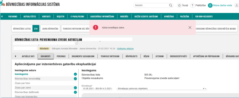 Aizpildot apliecinājumu par būves gatavību ekspluatācijai, uzrāda "Kļūda ievadītajoes datos"