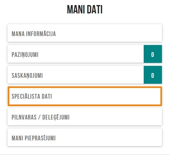 BIS paneļa nodalījumā MANI DATI ir pieejama sadaļa SPECIĀLISTA DATI: